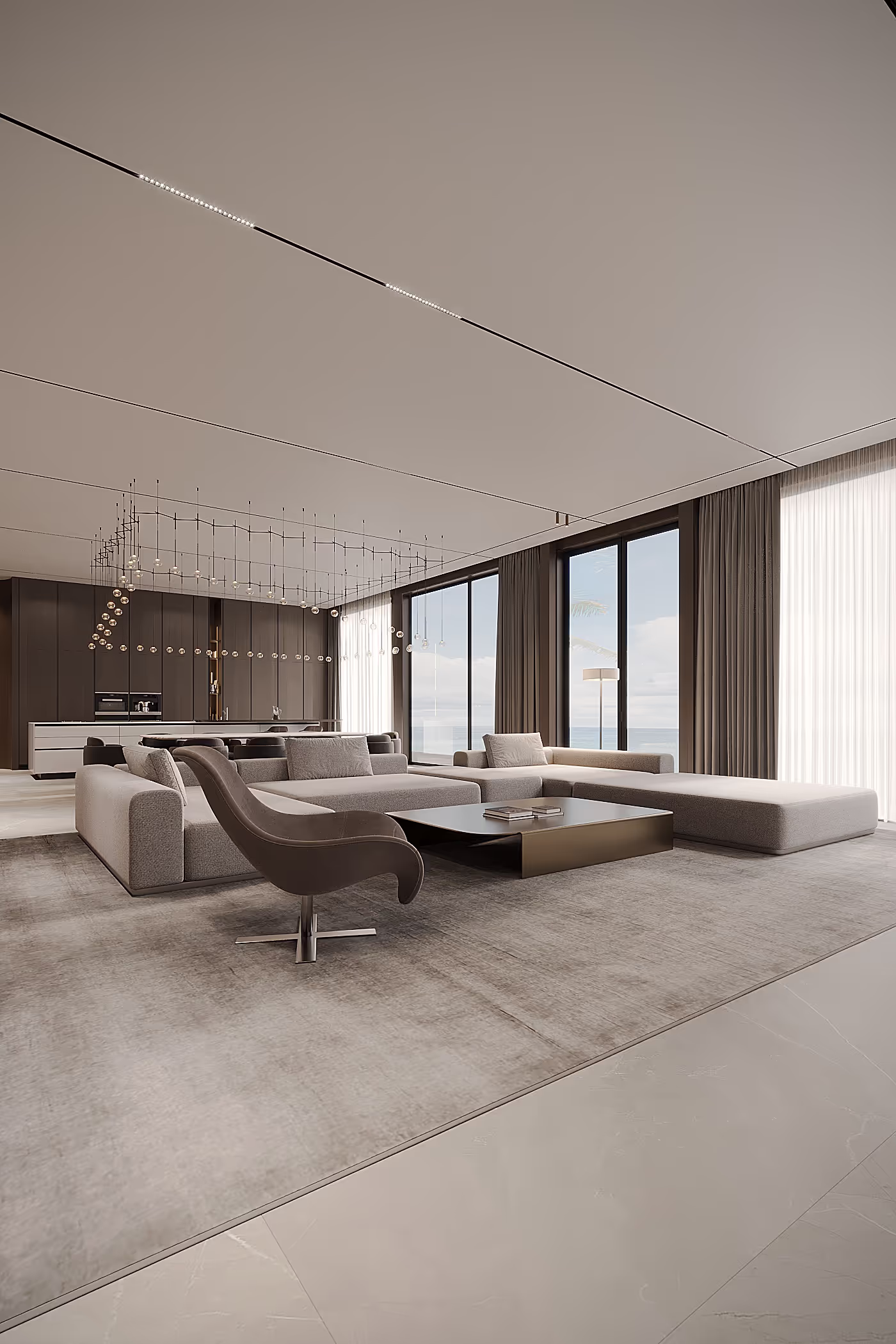 Цей простір – більше, ніж просто інтер’єр. Це історія про баланс між природою та архітектурою, між світлом і тінню, між матеріальним і нематеріальним. Резиденція, розташована на острові Palm Jumeirah, є зразком мінімалістичної елегантності, де кожна лінія, кожен матеріал і кожен відтінок працюють на створення атмосфери спокою, розкоші та свободи.