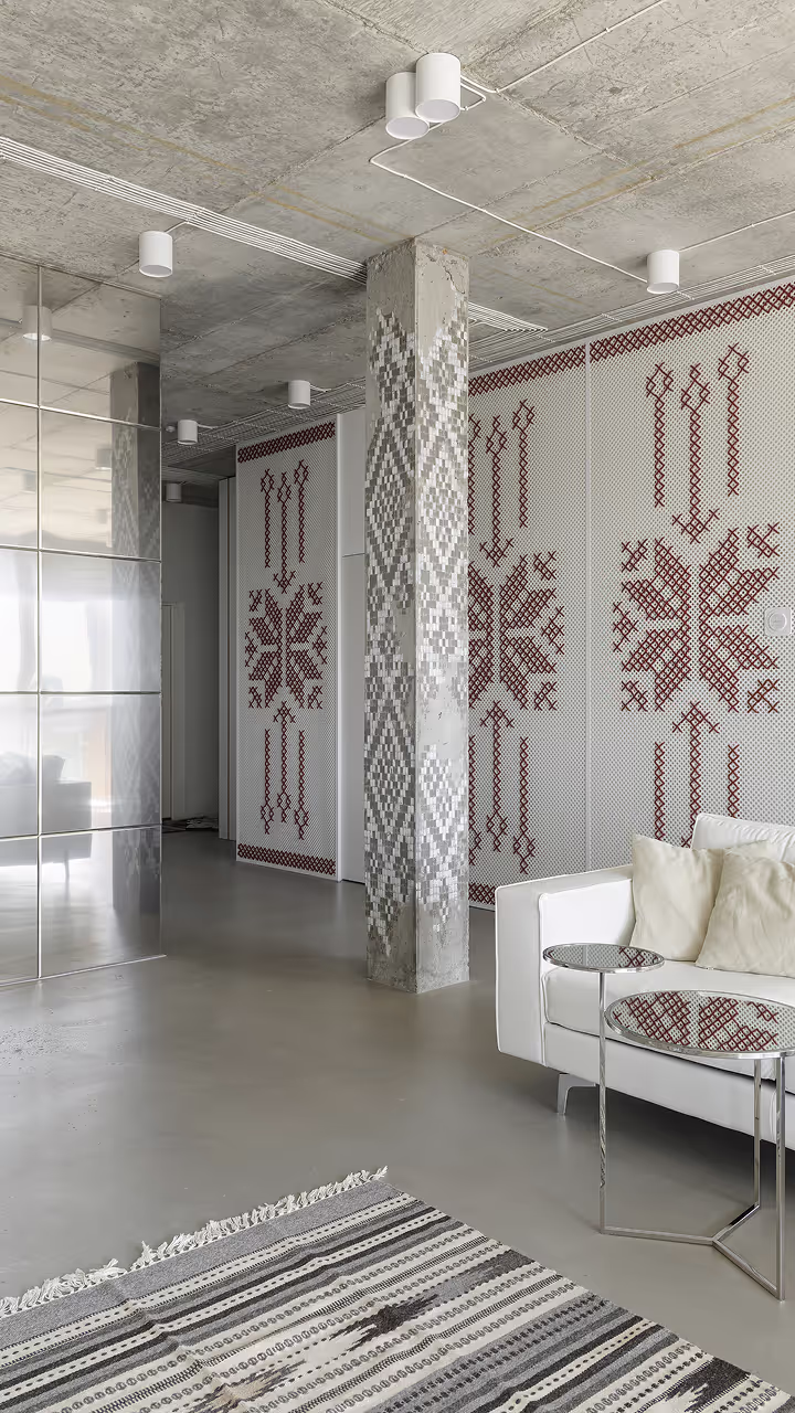 Ця резиденція — не просто квартира, а маніфест української культури, сучасного мистецтва та національної ідентичності. Вона належить художниці, яка через кожну деталь простору транслює історію, що живе в серцях українців. Це місце сили, де автентичні орнаменти, фактурний бетон і природні матеріали формують особливу атмосферу свободи, творчості й гордості за своє коріння.